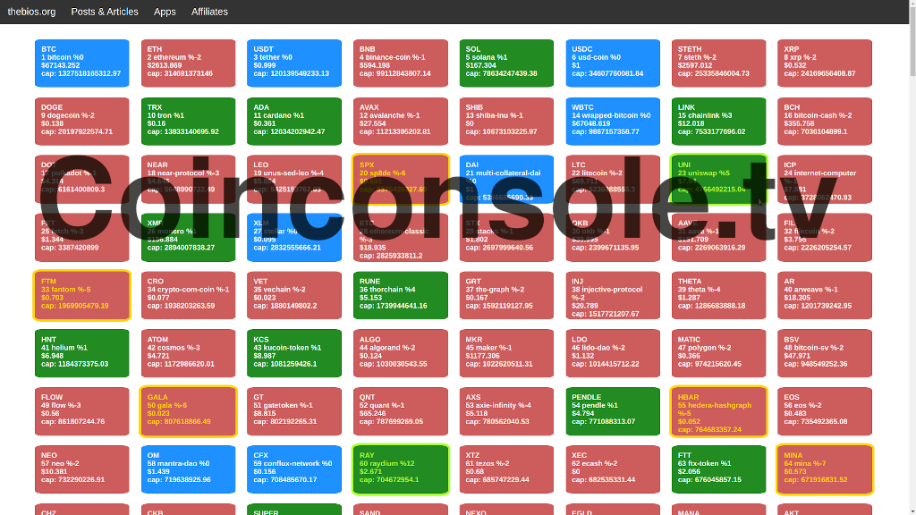 Introducing coinconsole.tv a simplified cryptocoin analyzer. This web app currently shows the top 500 coins with live price data. the color coding currently reflects the rest api data, so do a refresh once in a while to update the color coding. By using ctlr+ and ctlr- you can see as many coins on your screen as you like. All 500 at once if you like. Using the color coding and highlighting you can easily hone in on coins that are up or down. If for example a coin is up 1% in the last 24 hours it will be green and if it is down 1% it will be red. If it is up 5% or more it will be green but outlined with neon green. If it is down 5% or more it will be red with an orange outline. If the coin has not changed at least 1% in the last 24 hours it will be blue.